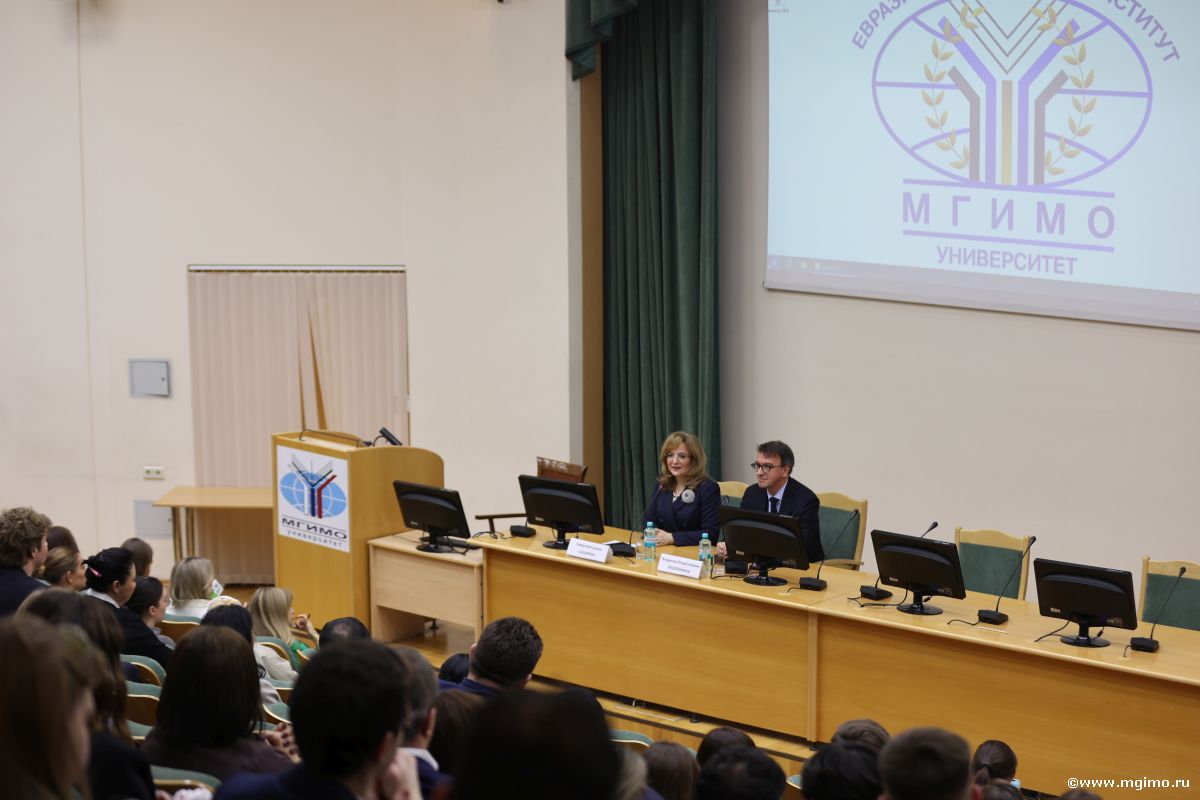 В.В.Масленников поздравил собравшихся с поступлением в ЕУИ и началом учебного года. Он поблагодарил профессорско-преподавательский состав Института и МГИМО за большой вклад в подготовку профессионалов-международников, особенно по тематике евразийского сотрудничества. Дипломат пожелал магистрантам успешно освоить новые программы ЕУИ и эффективно использовать полученные знания в профессиональной деятельности. Он поделился некоторыми соображениями относительно происходящих фундаментальных тектонических сдвигов в мировой политике. В настоящее время мировое большинство консолидирует усилия по формированию нового многополярного миропорядка, а коллективный Запад продолжает попытки сохранить свое доминирование, реализуя деструктивную санкционную политику и проводя форсированную милитаризацию. В.В.Масленников подчеркнул, что в этих условиях главной задачей, в том числе, становится создание новой архитектуры евразийской безопасности и сотрудничества. Основой для такой работы может стать инициатива Президента Российской Федерации В.В.Путина о создании Большого евразийского партнерства. Он выразил уверенность, что в стенах ЕУИ студентам удастся глубоко вникнуть в особенности развития международных процессов, приобрести знания и навыки необходимые для укрепления международных позиций России.